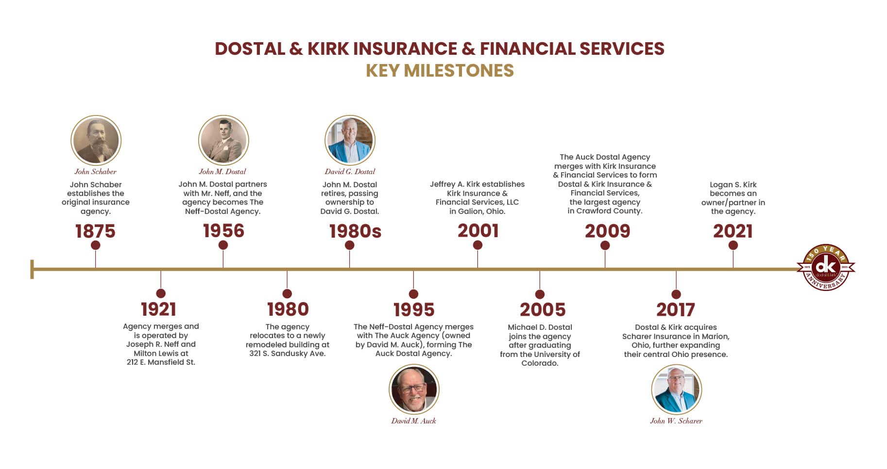 In March of 2009, The Auck Dostal Agency merged with Kirk Insurance & Financial Services, LLC. Kirk Insurance & Financial Services was formed by Jeffrey A. Kirk in 2001. Mr. Kirk, a Crawford County native, returned to his hometown of Galion to open the agency after a successful career as an Insurance Company Executive over a 20-year span.