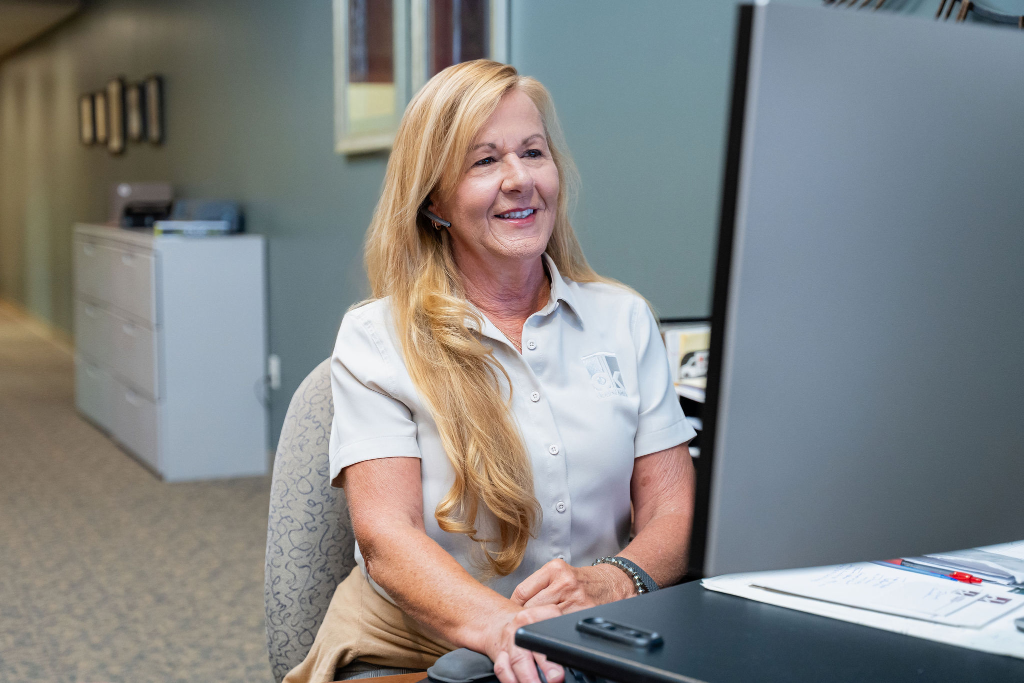 Dostal & Kirk team member in a blue polo shirt talking on the phone